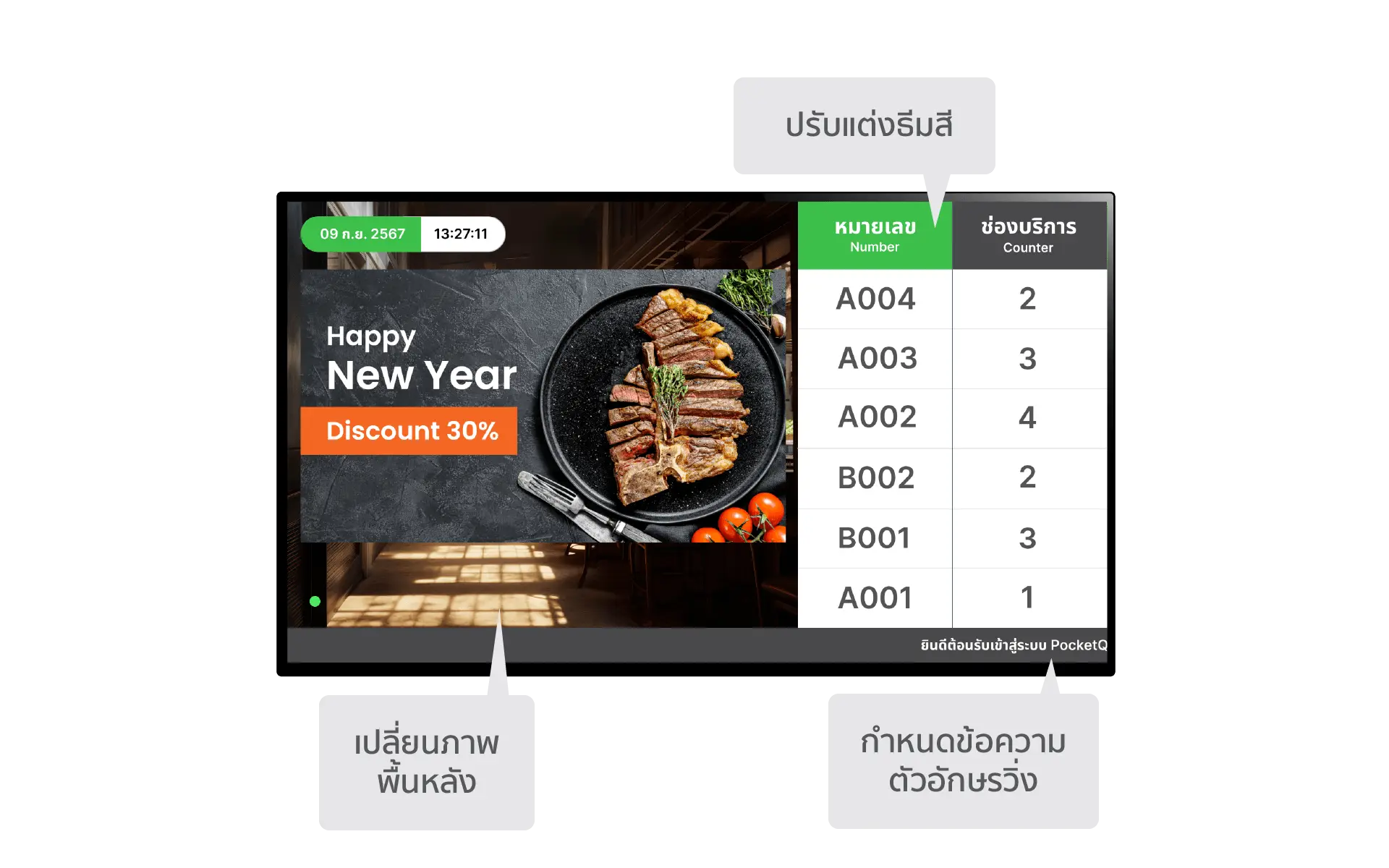 เป็นหน้าจอที่ใช้แสดงหมายเลขคิวที่ถูกเรียกแบบเรียลไทม์ พร้อมระบบเสียงแจ้งเตือน เพื่อให้ลูกค้าทราบและเตรียมเข้ารับบริการ โดยสามารถแสดงหมายเลขคิวที่ถูกเรียกล่าสุดและหมายเลขคิวถัดไป มีระบบเสียงแจ้งเตือนเมื่อมีการเรียกคิวใหม่ และรองรับการแสดงสื่อโฆษณาหรือข้อความตัวอักษรวิ่งเพื่อให้ข้อมูลเพิ่มเติมแก่ลูกค้า